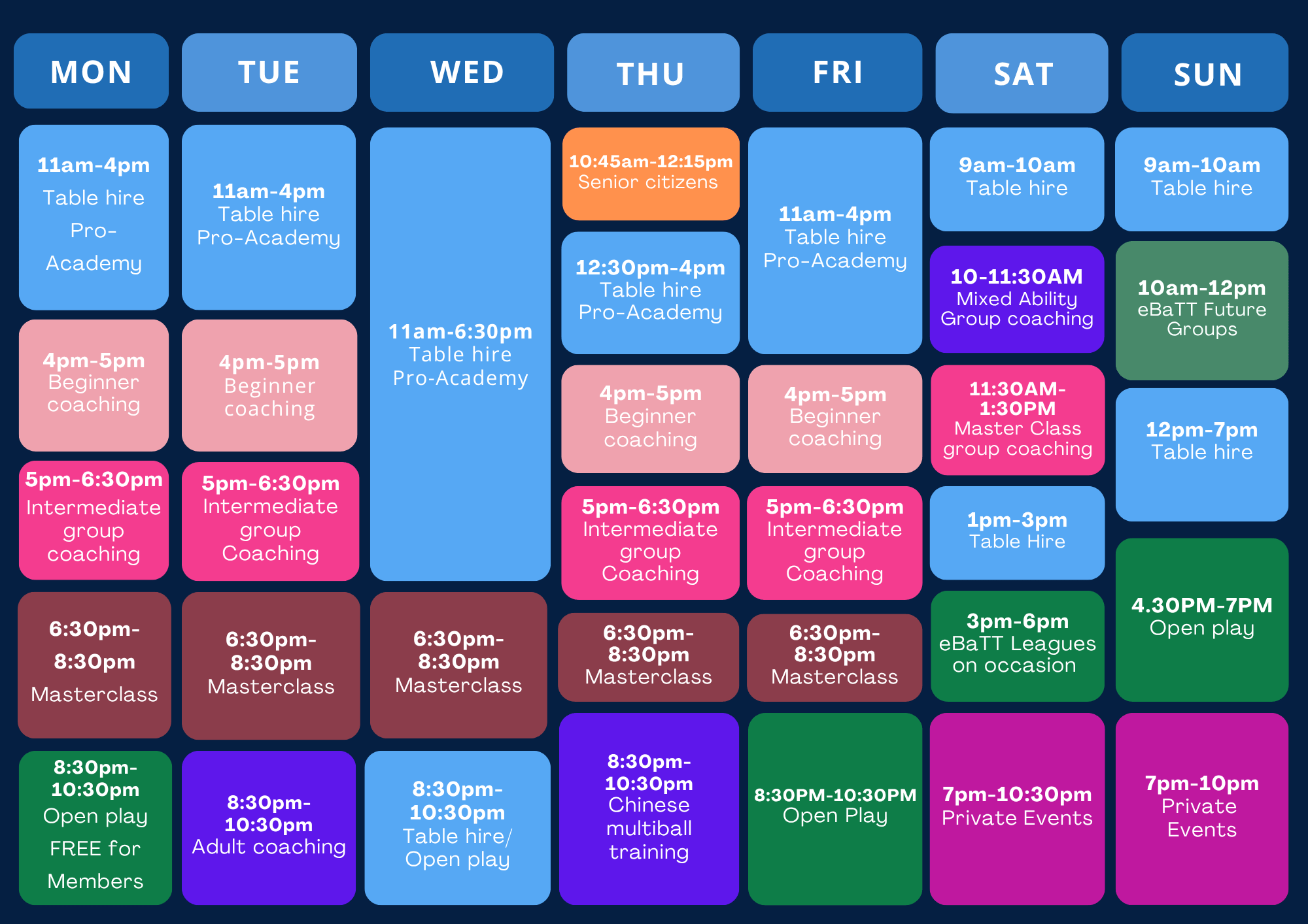 50+ Weekly Table Tennis Group Sessions – Tailored to Your Needs With over 50 group sessions per week, we offer a variety of coaching and open play options to meet your individual requirements. To view our full schedule and book your session, simply scroll up to the interactive timetable.